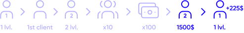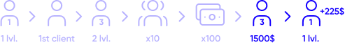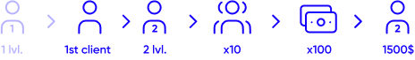 合作伙伴 1(第1层)注册并开始推荐客户。 他们注册了 10 个客户。 这些客户一起放置了 100 手。 根据合作伙伴奖励计划的条款,合作伙伴 1 每手将获得 15 美元。 因此,他们将获得 100x15美元 = 1,500美元。